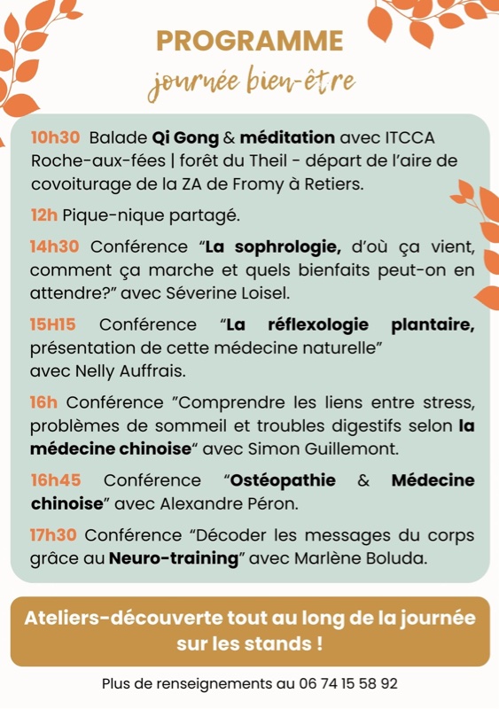 Venez découvrir la réflexologie plantaire, la sophrologie, le neuro-training et la médecine chinoise lors de la journée bien-être à la salle polyvalente de Retiers le dimanche 6 octobre prochain !